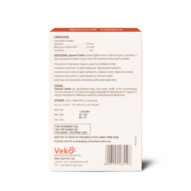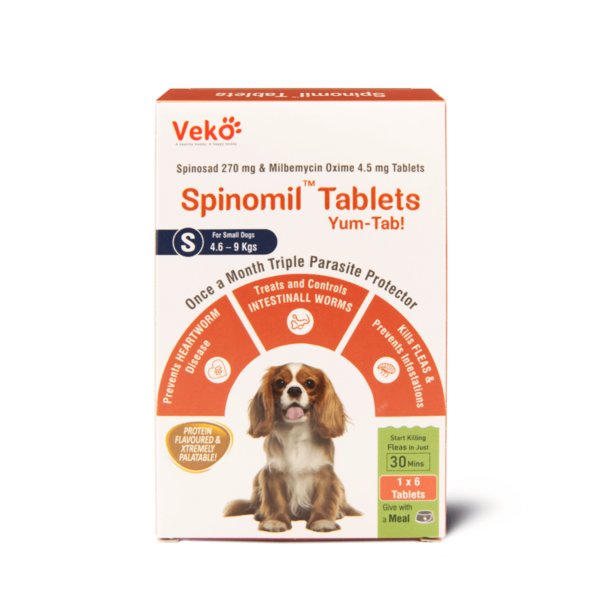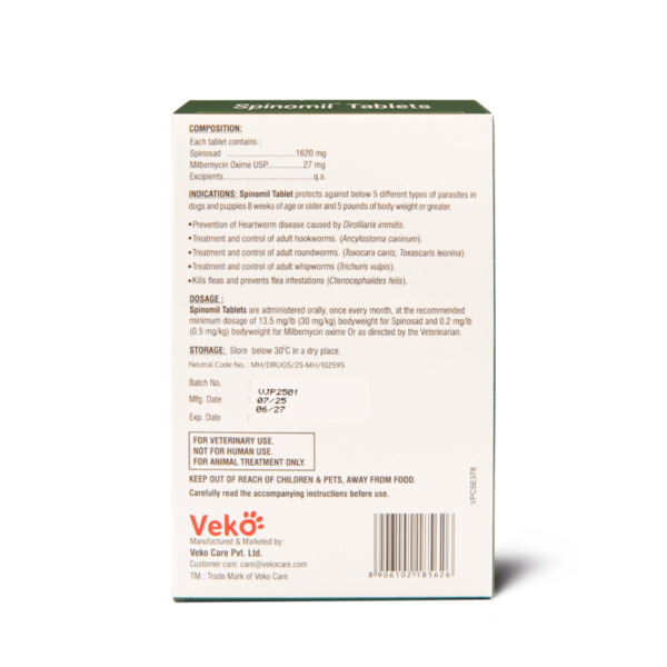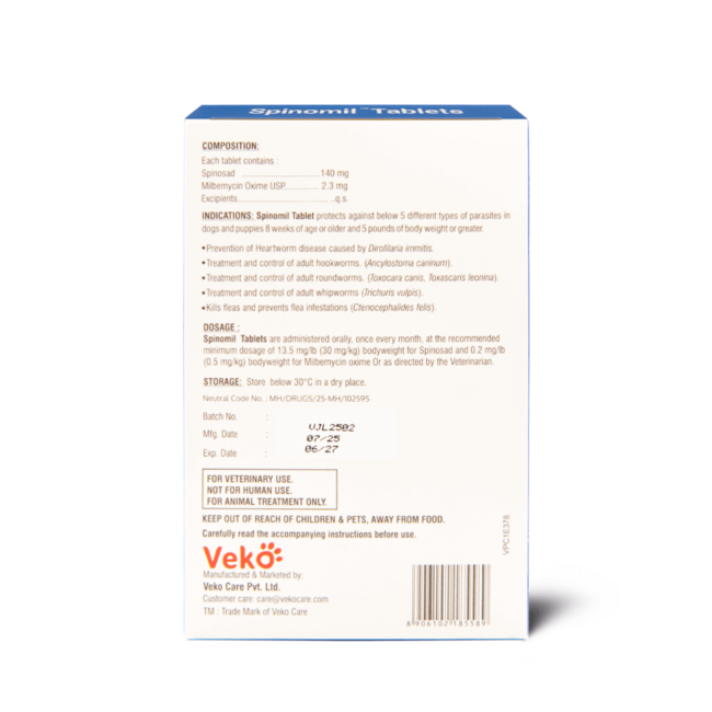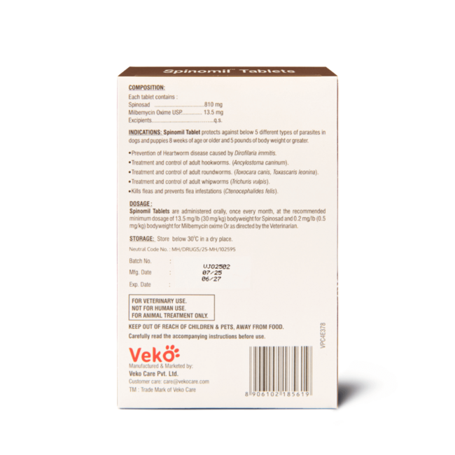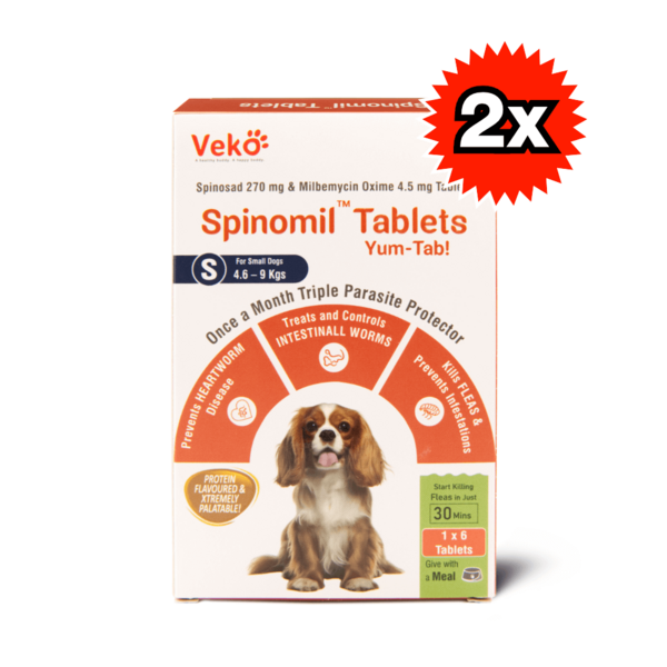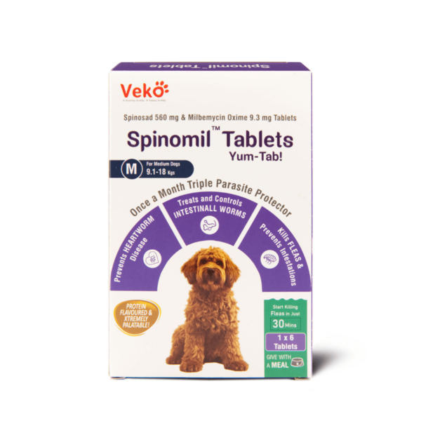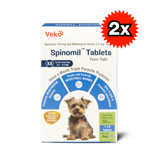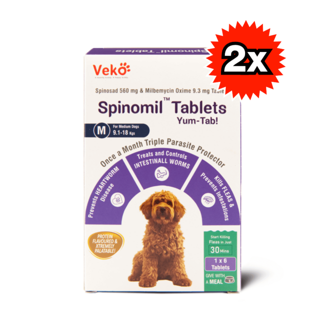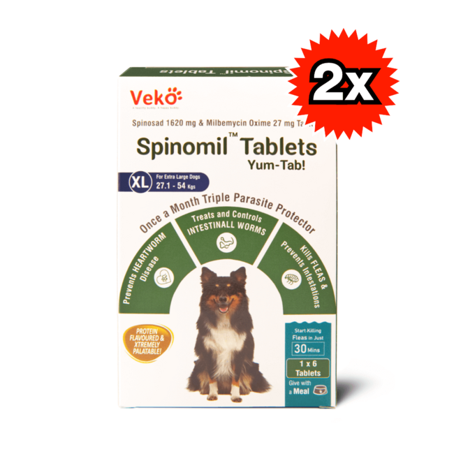 Spinomil (Generic Trifexis) kills fleas and prevents flea infestations, prevents heartworm disease, and treats and controls adult hookworm, roundworm and whipworm infections in dogs. Spinomil is an all in one treatment for fleas, heartworm preventive and intestinal parasite control. Spinomil contains the same active ingredients as Trifexis. Spinomil must be administered monthly.