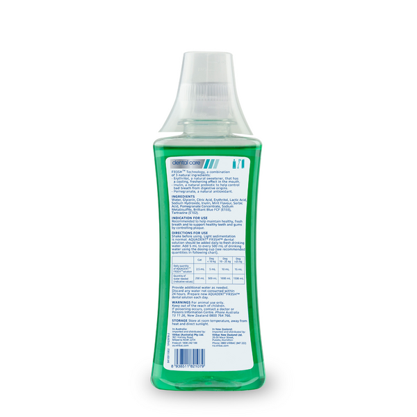 Virbac Aquadent FR3SH is available in 250ml and 500ml bottles, making it convenient for households of different pet sizes and needs.